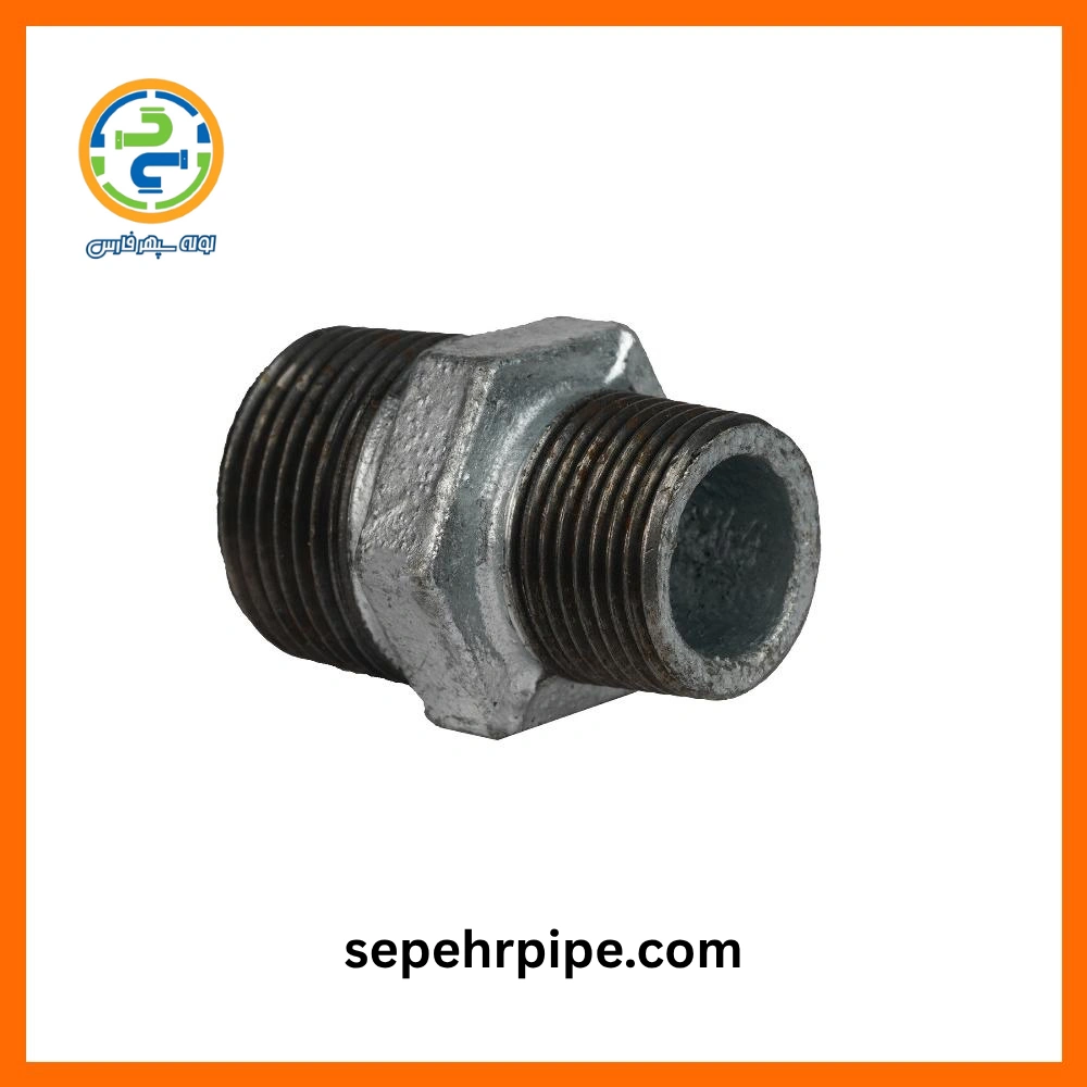 اتصال مغزی تبدیل گالوانیزه سایز 1 در 1/2 اینچ چینی (معادل نمره 3*2 لوله اتصالات فلزی) هر دو سر اتصال روپیچ جهت اتصال دو محصول لوله یا اتصال غیر هم سایز از لولهکشی تاسیسات مکانیکی مورد استفاده قرار میگیرد.